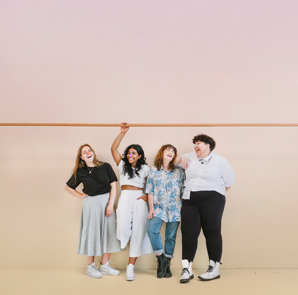 Four women standing side-by-side wearing color NÖZ sunscreen on their noses.